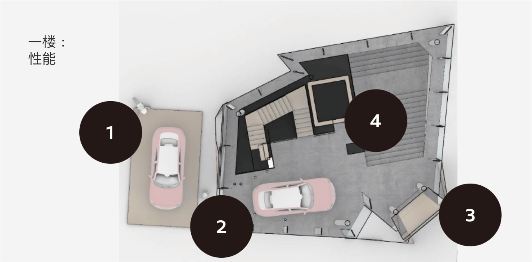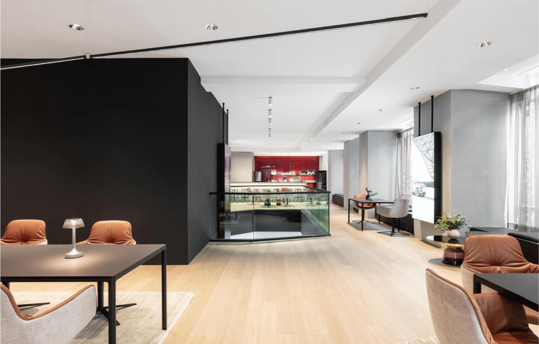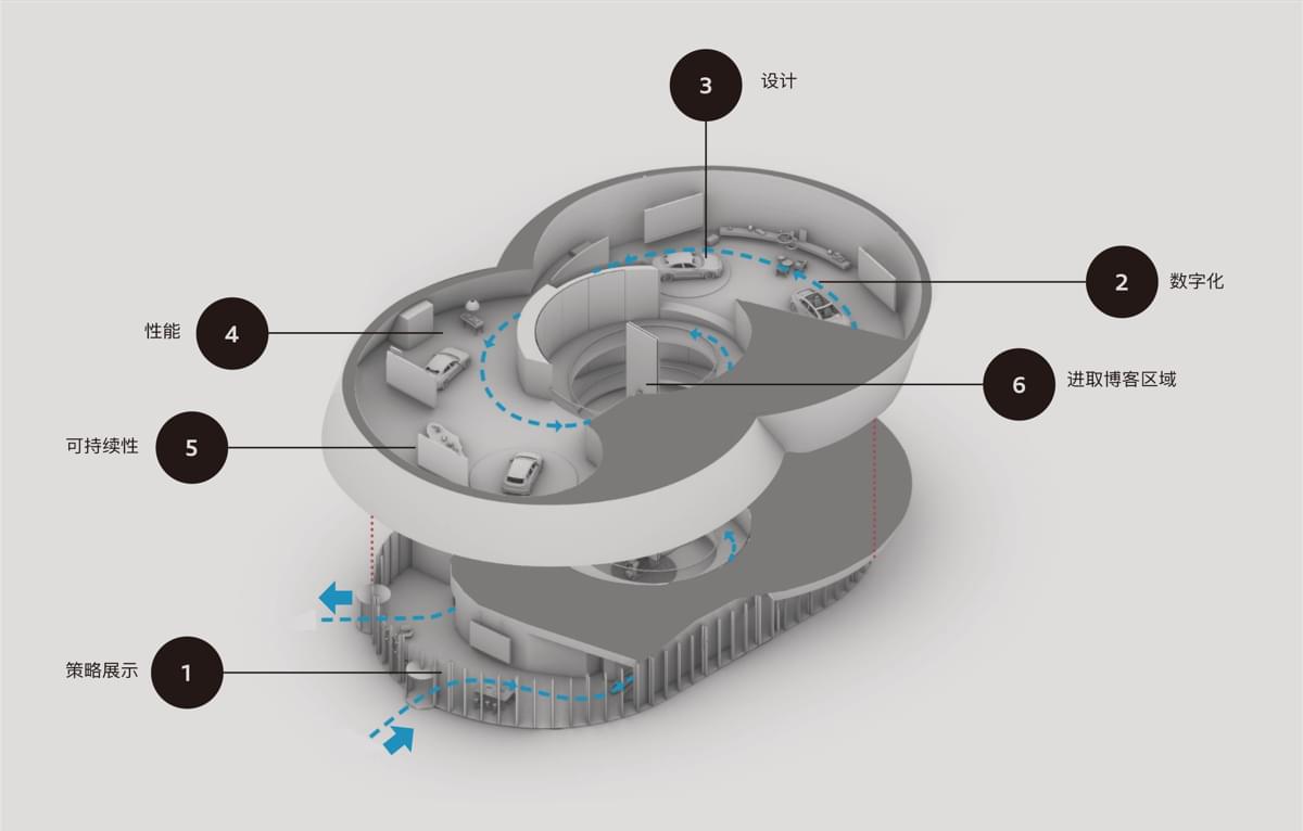 空间开阔的品牌空间,清晰的设计语言精心设计的视角,车辆处于最佳视野中通过圆形地面、家具、内容和照明,将品牌话题融入品牌空间 -