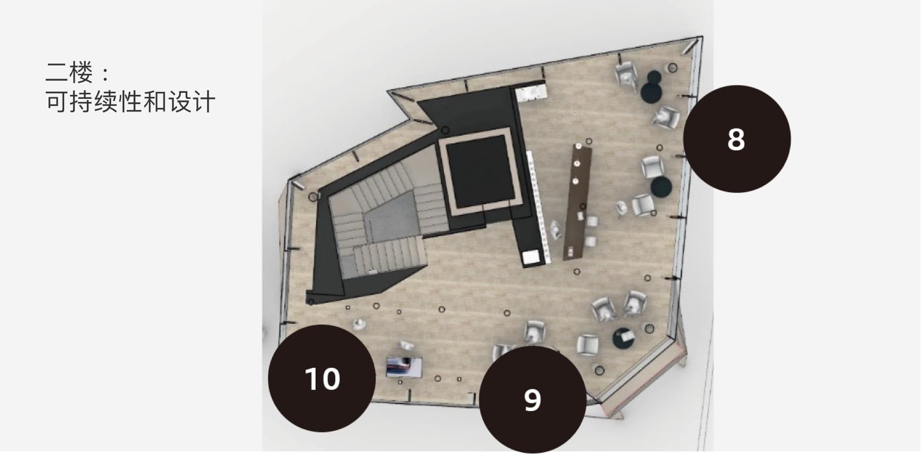 气氛营造品牌空间宽敞怡人。我们的品牌话题有着高对比度的展示(例如“可持续性”)