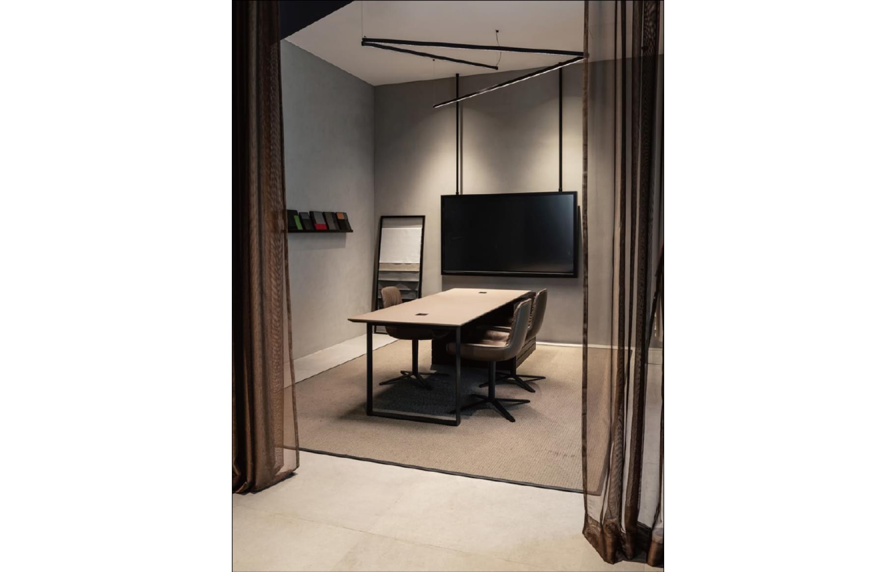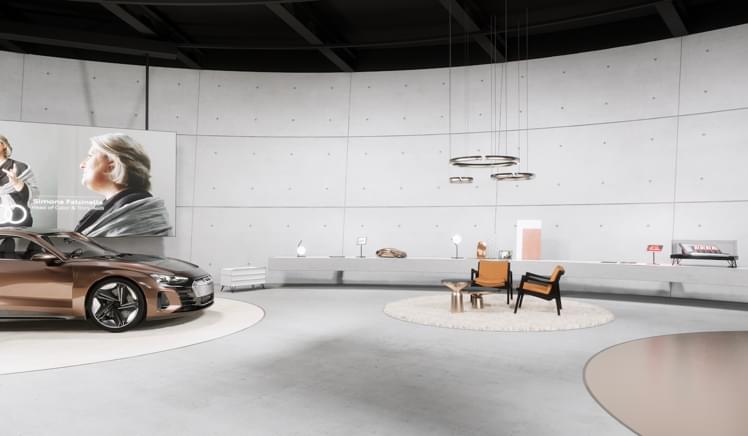 气氛营造展示分为四个品牌话题(设计、数字化、性能、可持续性) — 明确展示每个主题,并配有相应的照明、家具和摆件。