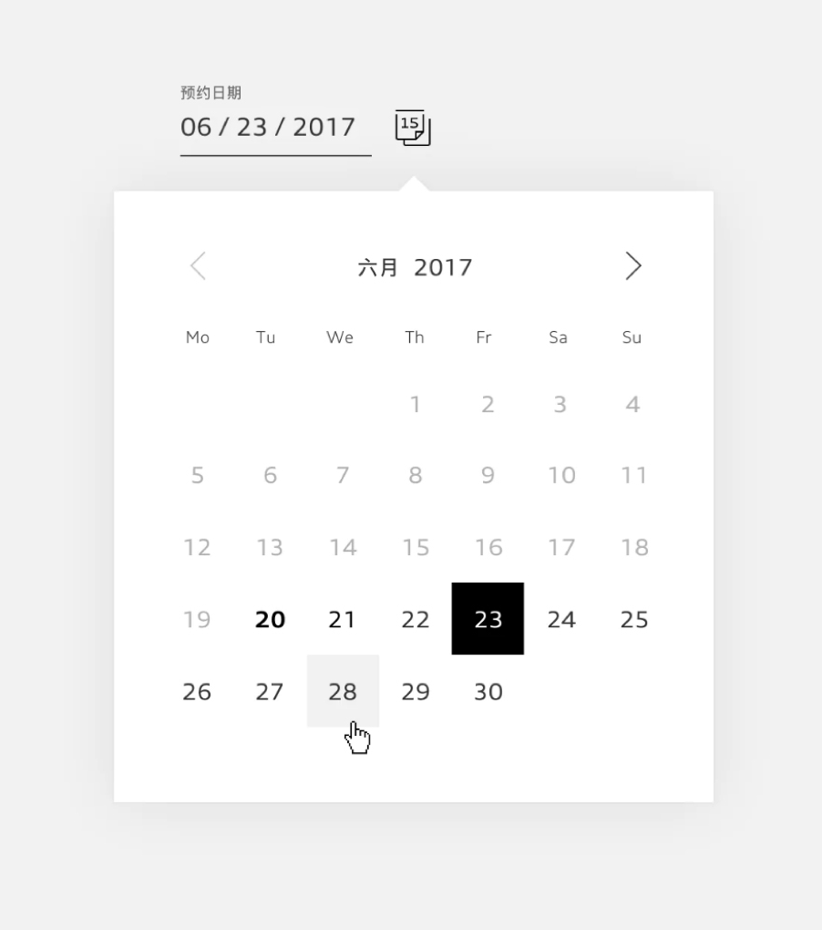 日历对于选择未知的日期特别有帮助。它被添加到一个输入栏中,作为一个可替代的输入选项,例如,以弹出式的形式(如右图)。如果用户可以选择一个日期的时期有限,那么就不需要输入框了。在移动设备上,操作系统的本地日期选择器是输入首选。