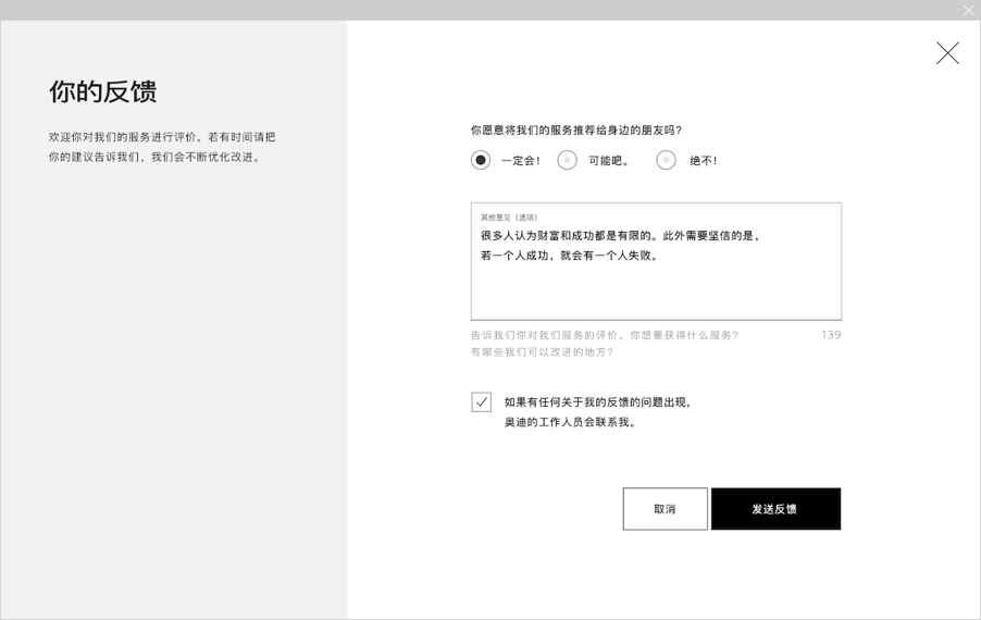 表单是连接用户和奥迪应用程序之间的一个特别重要的渠道。 它们经常出现在用户使用过程的关键点上。出于这个原因,表单的设计应使其易于理解,并应尽可能减少问题的数量。