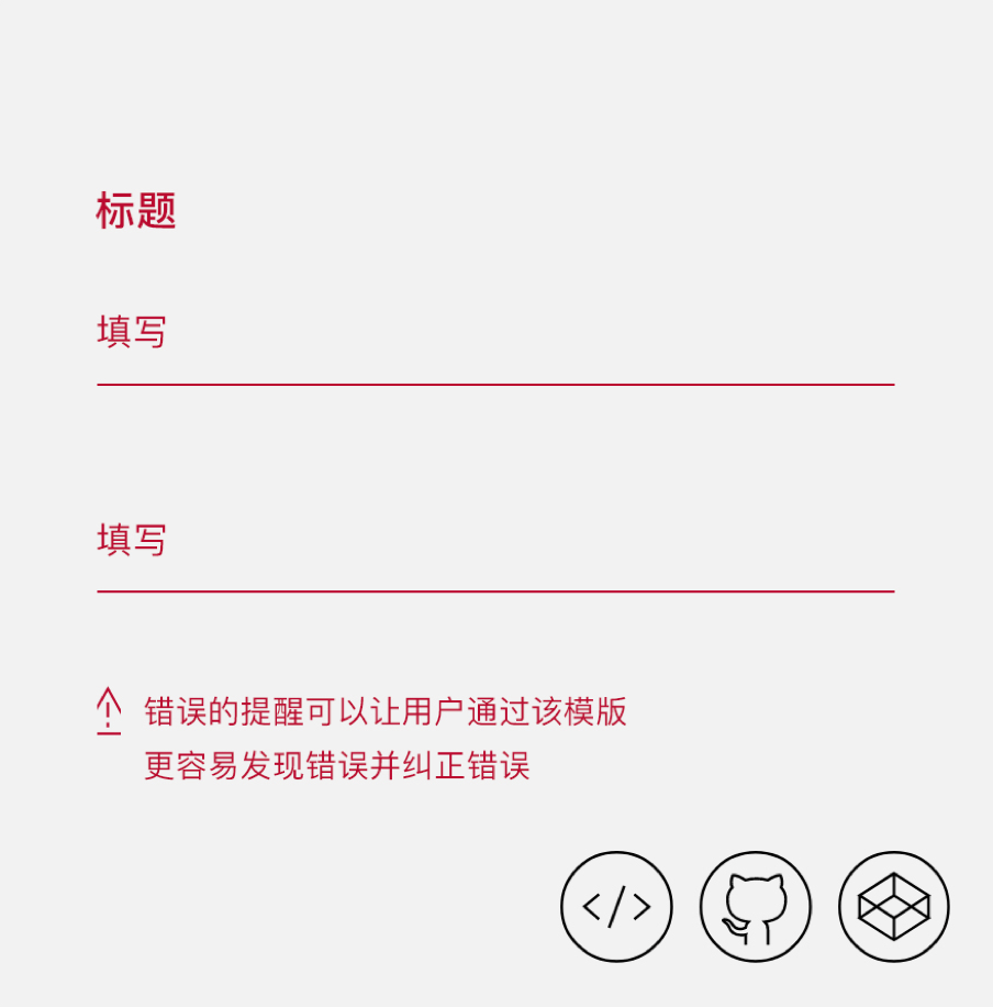 错误的输入会以红线、红色标签、红色描述错误的方式表示,如果是一个组,则以红色组为标题。